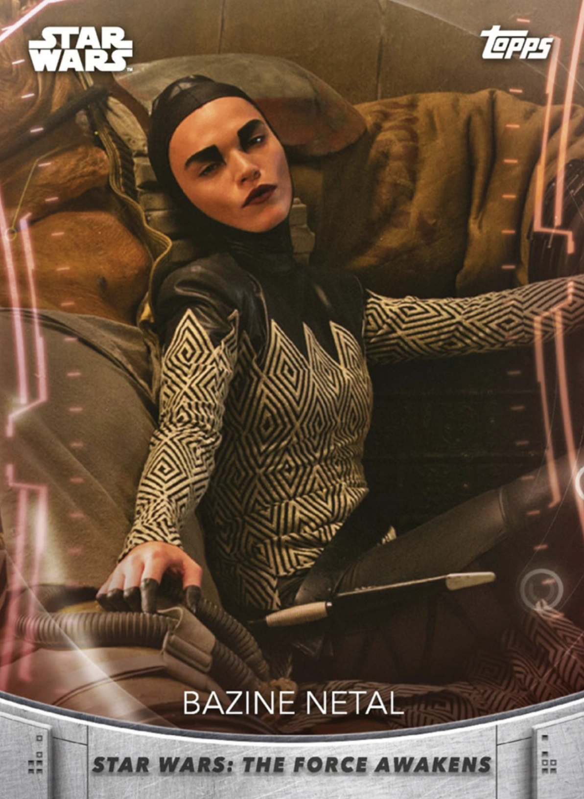 One of the most-feared bounty hunters in the galaxy, Bazine Netal honed her deadly martial arts skills at Delphi Kloda's combat school on Chaaktil. She was impeccably-dressed for her profession, wearing a battleweave[2] dress that jammed sensors; and a black cowl that hid burn damage inflicted upon her as a youth. Bazine's weapons of choice included a snub-nosed blaster, throwing knives, and poisoned daggers.