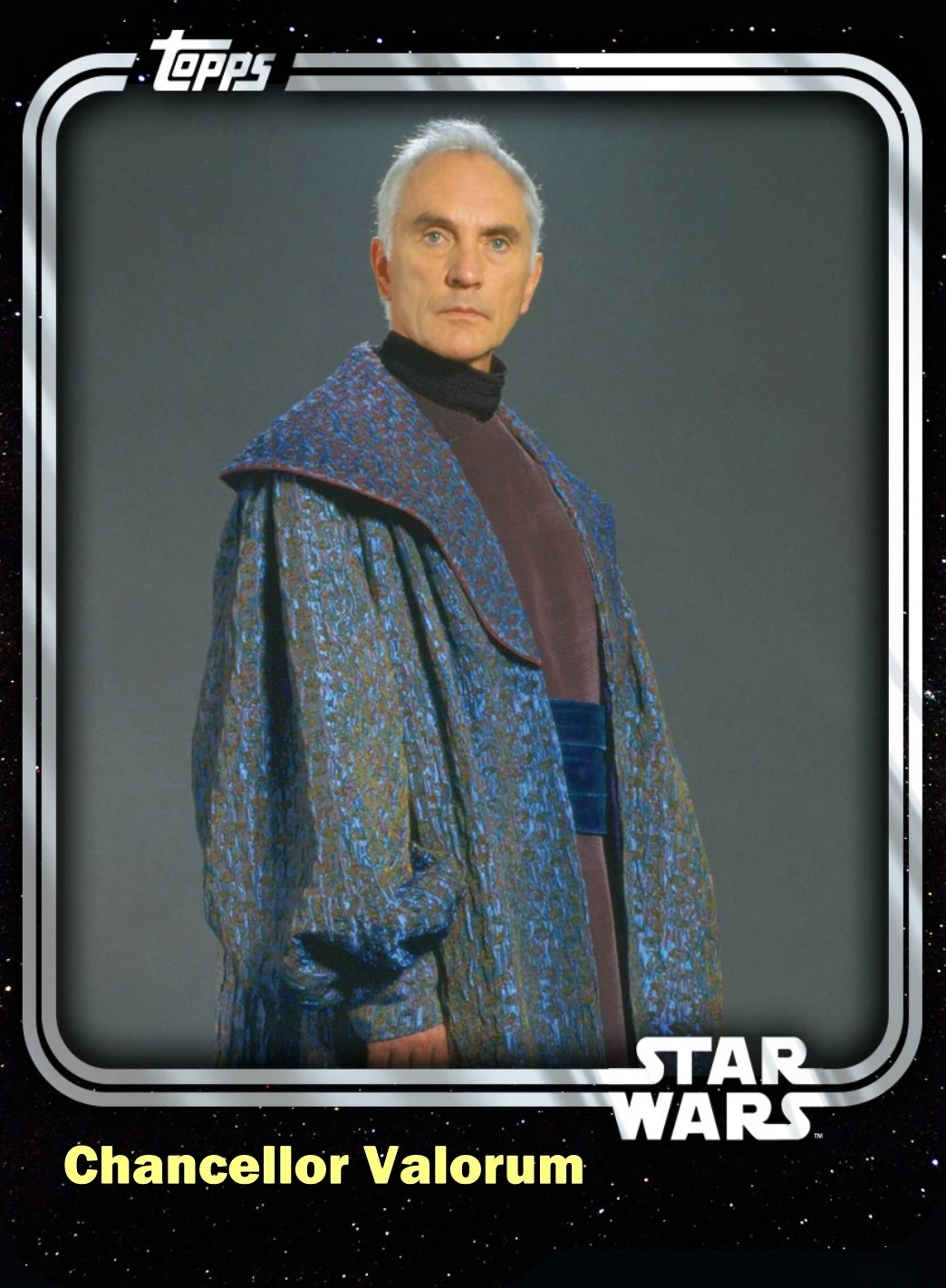 A progressive diplomat of ancient and distinguished lineage, Finis Valorum is Chancellor of the Galactic Senate. But this high position is successfully challenged by another progressive, Queen Amidala. It is Amidala, who introduces a devastating Vote of No Confidence in Valorum after the Trade Federation invasion of Naboo goes unchecked. However, Amidala is manipulated by Senator Palpatine into taking this drastic course, and regrets disgracing the Chancellor, but feels there is no other way to rescue her people.