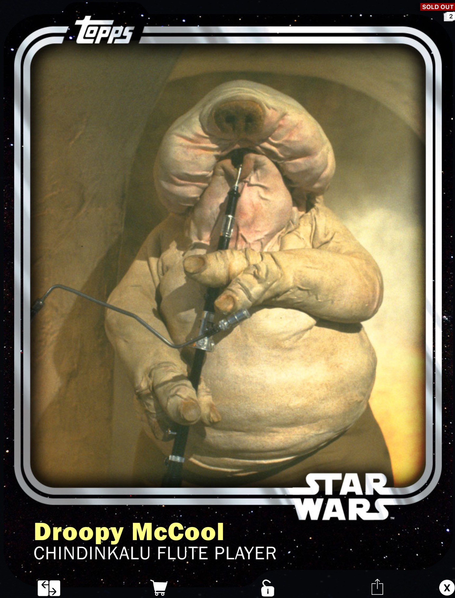 A member of the Max Rebo band, Droopy McCool's real name is Snit, and he hails from the planet Kirdo III. Snit plays a flute made from a hollow chindinkalu plant that is native to his home world. Fellow band member Sy Snootles becomes quite taken with him, and it is she who suggests that he change his name to the more palatable (for an entertainer) Droopy McCool. Both are against Max Rebo's hasty decision to establish the band as a permanent attraction in Jabba the Hutt's court.